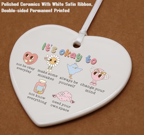 Funny Inspirational Affirmations - Educational Mental Health Gifts - Positive Motivational Encouragement - It's Ok to Feel Ceramic Heart Shaped Ornament