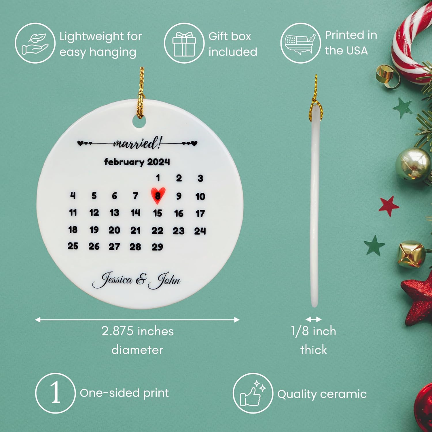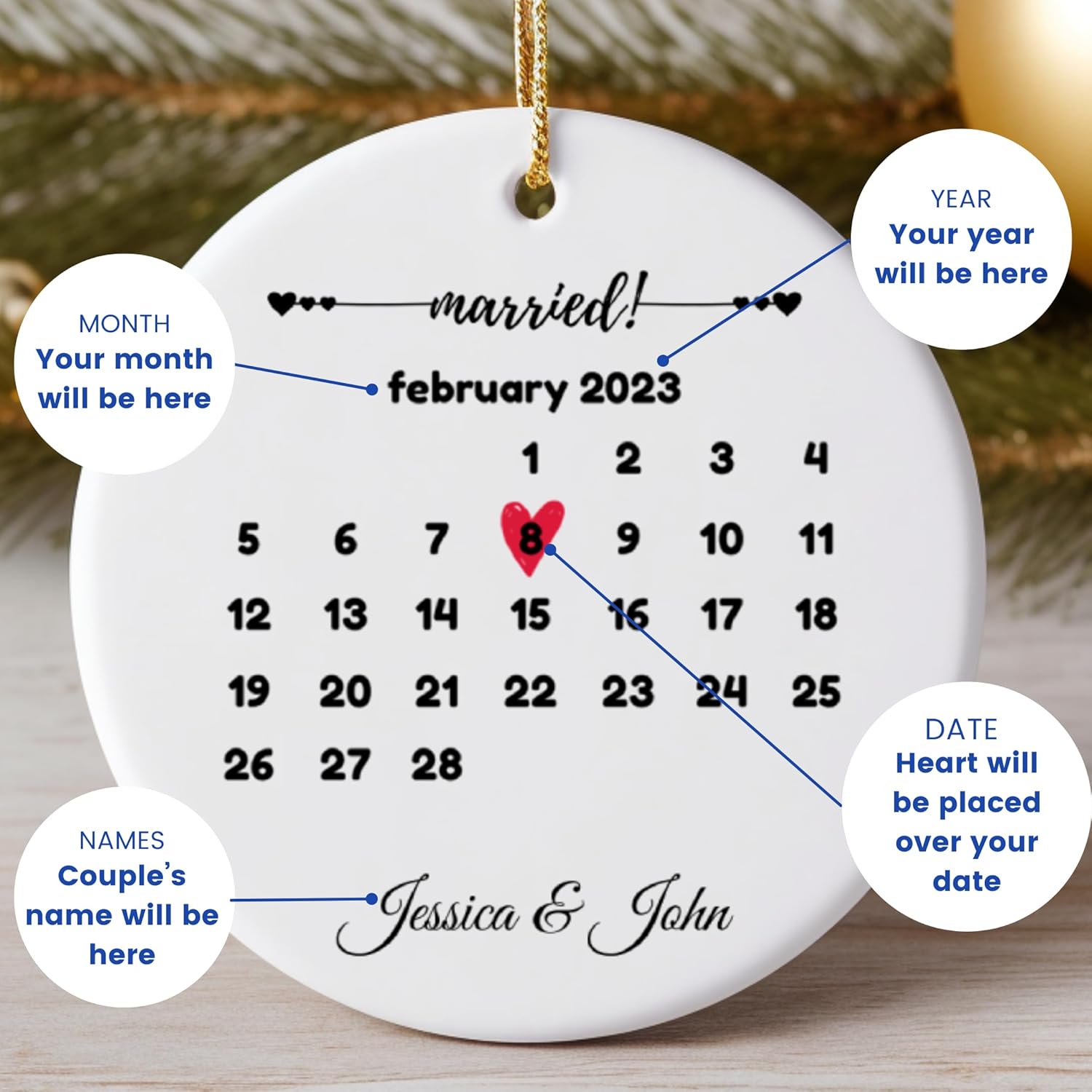 Generic Personalized Wedding & Anniversary Ornament Keepsake for Married Couples, White, ORNCB-RND-calmarried-1
