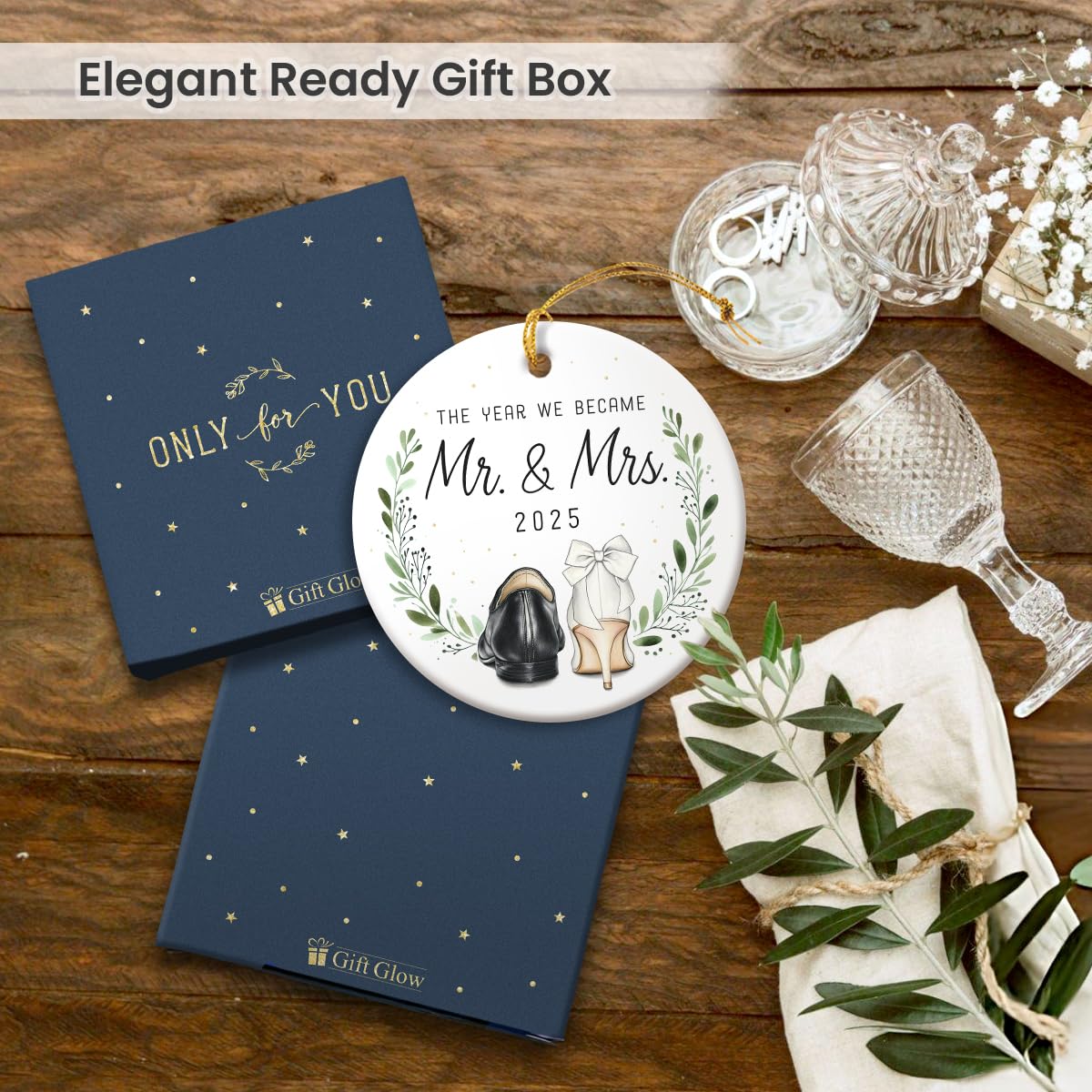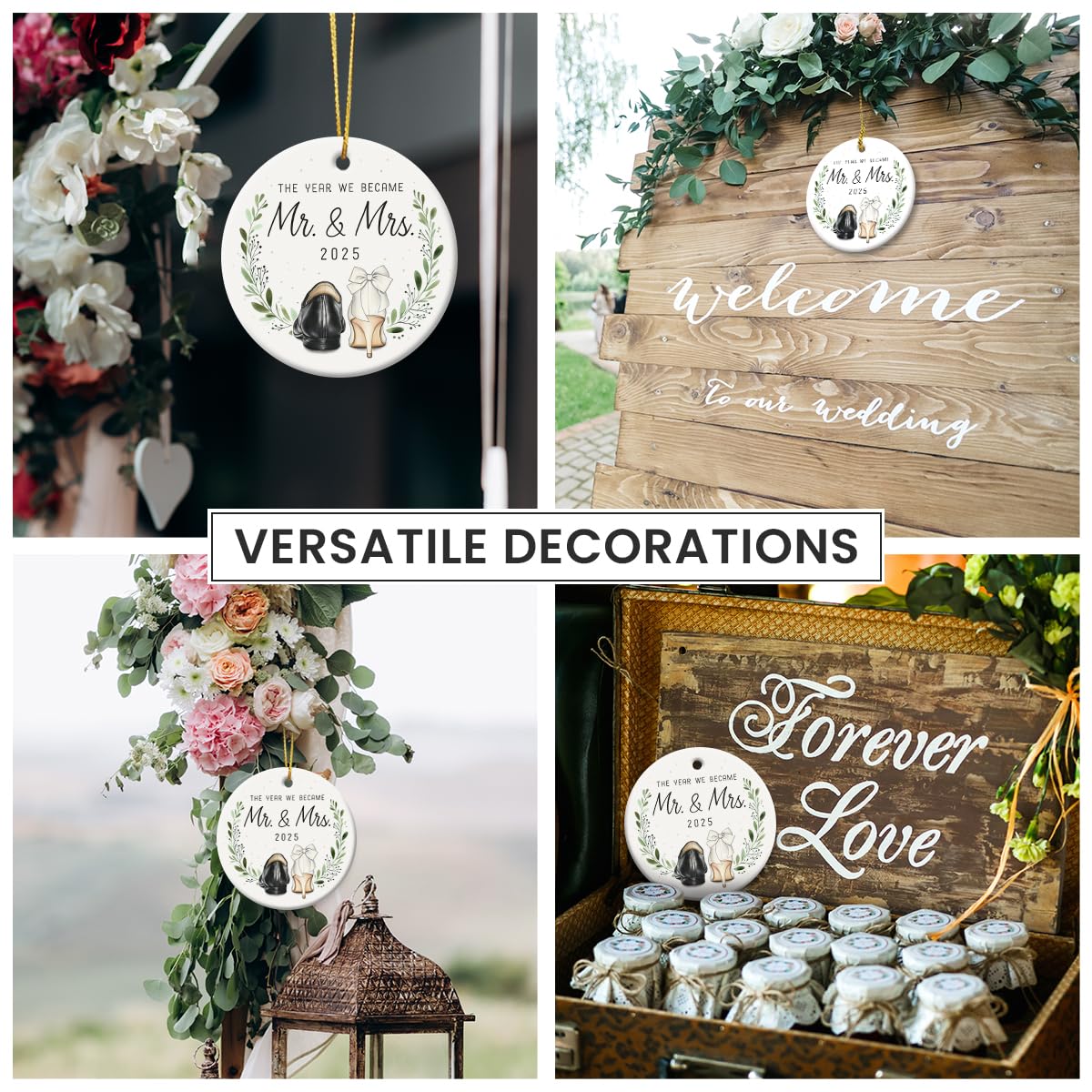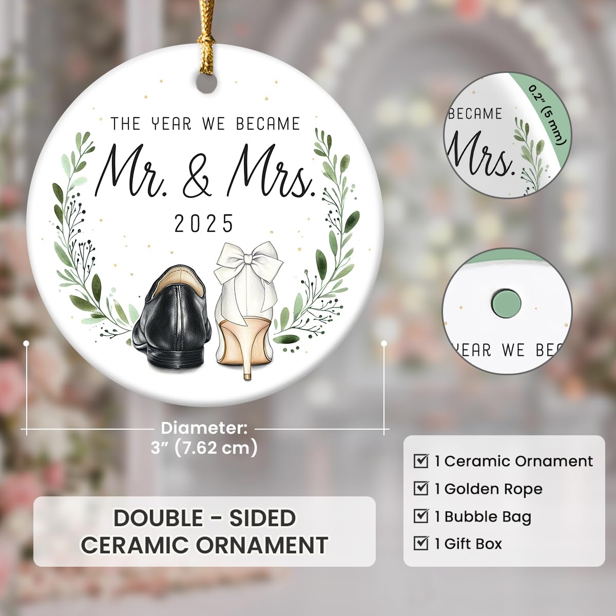 First Christmas Married Ornament 2025 - Engagement Gifts for Couples, Double Sided Ceramic Mr and Mrs Ornaments as Bridal Gift for Bride, Groom, Unique Wedding Gifts for Newlyweds Friends