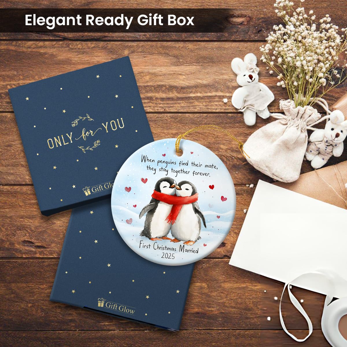 - ORNAMENT SET INCLUDES: You will receive 1x Wood Ornament, 1x Beige Ribbon and 1x Gift Box. The small hole in the ornament is threaded with our shining beige ribbon for easy hanging, which creates an elegant look for your Christmas tree.