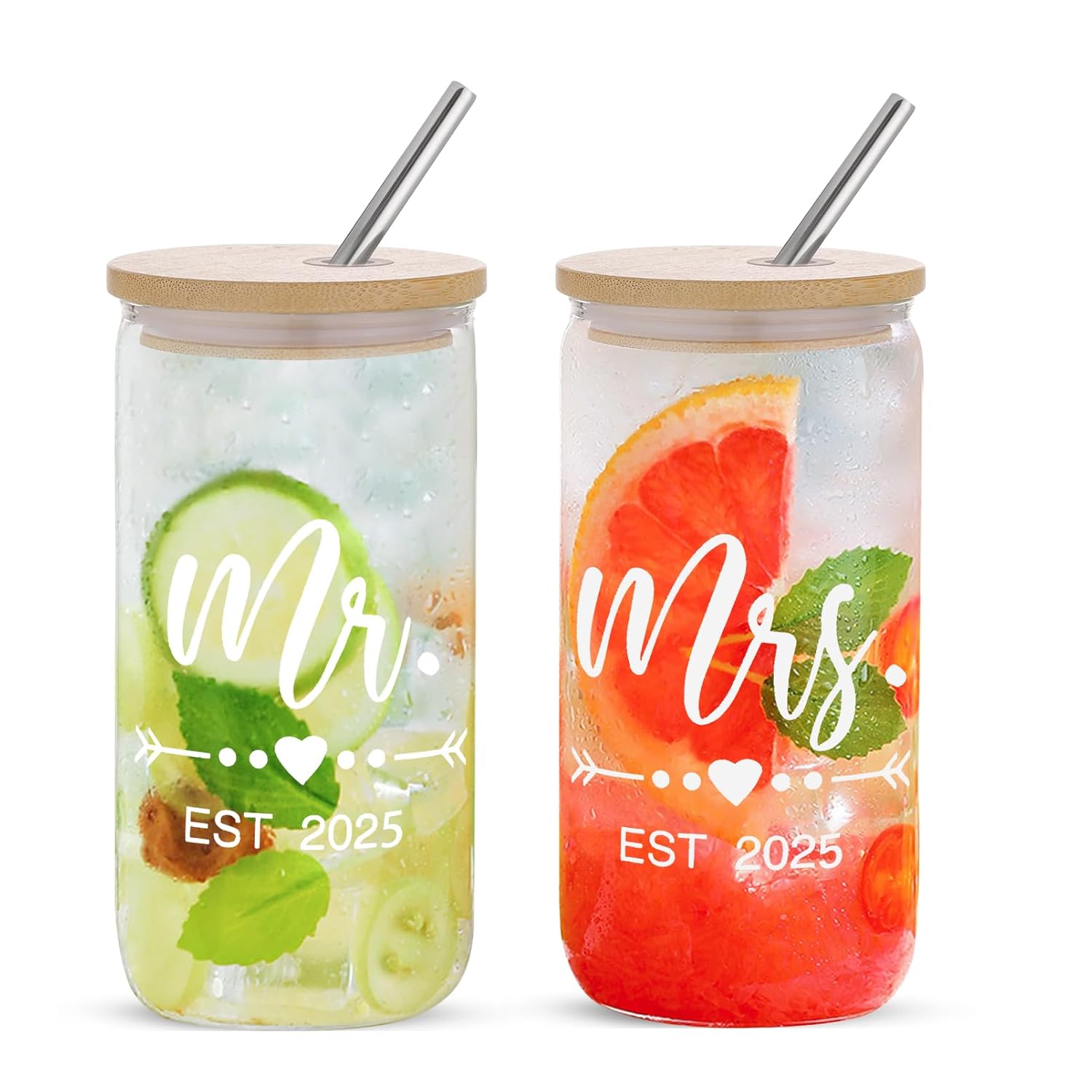 Mr & Mrs Coffee Cups 2025 Gift Set, Wedding & Engagement Gifts for Couples - His & Hers Glass Tumbler Set With Straw