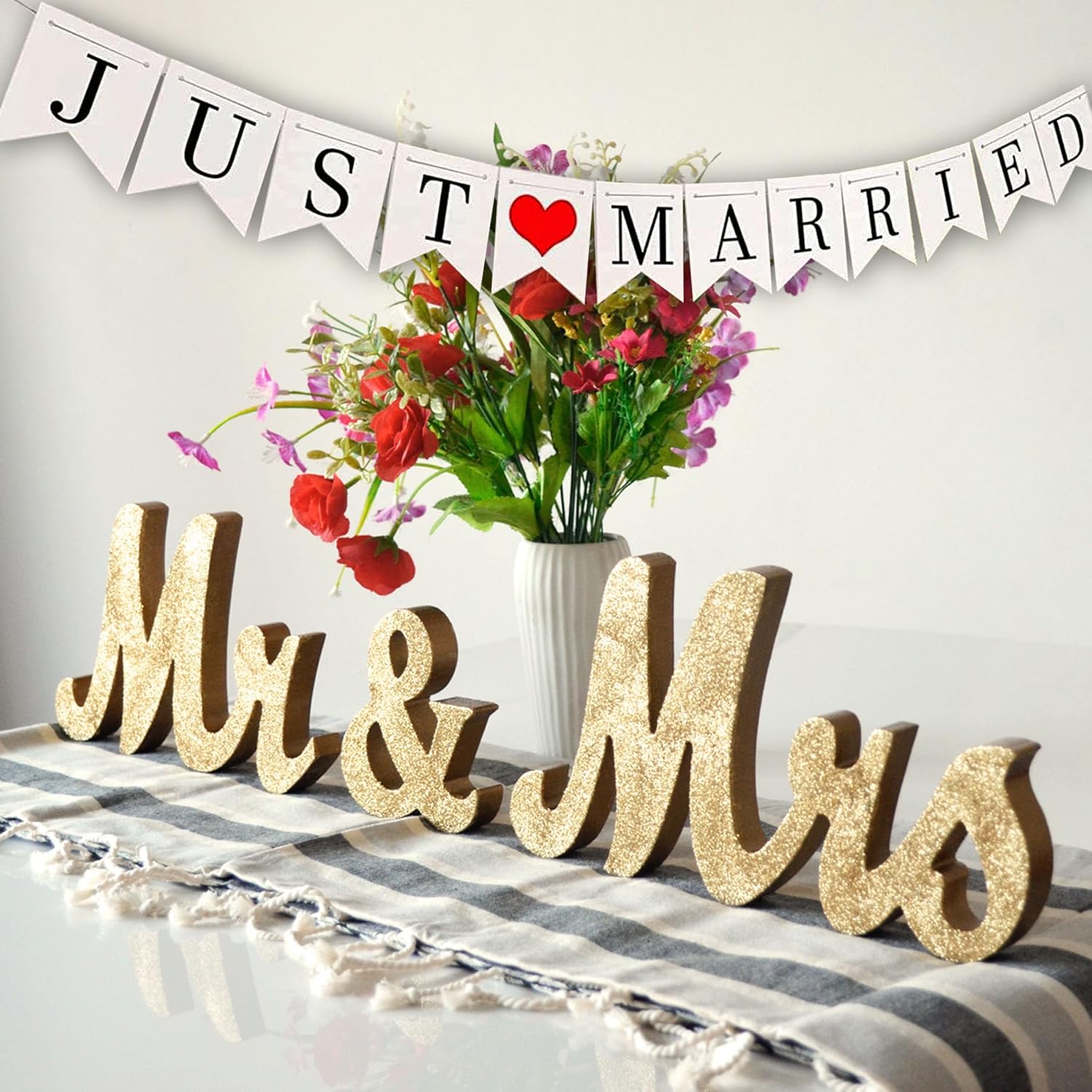 Mr and Mrs Tabletop Wedding Decoration - Wooden Freestanding Letters for Photo Props - Golden Glitter Decor Gift for Bridal Shower Anniversary Party