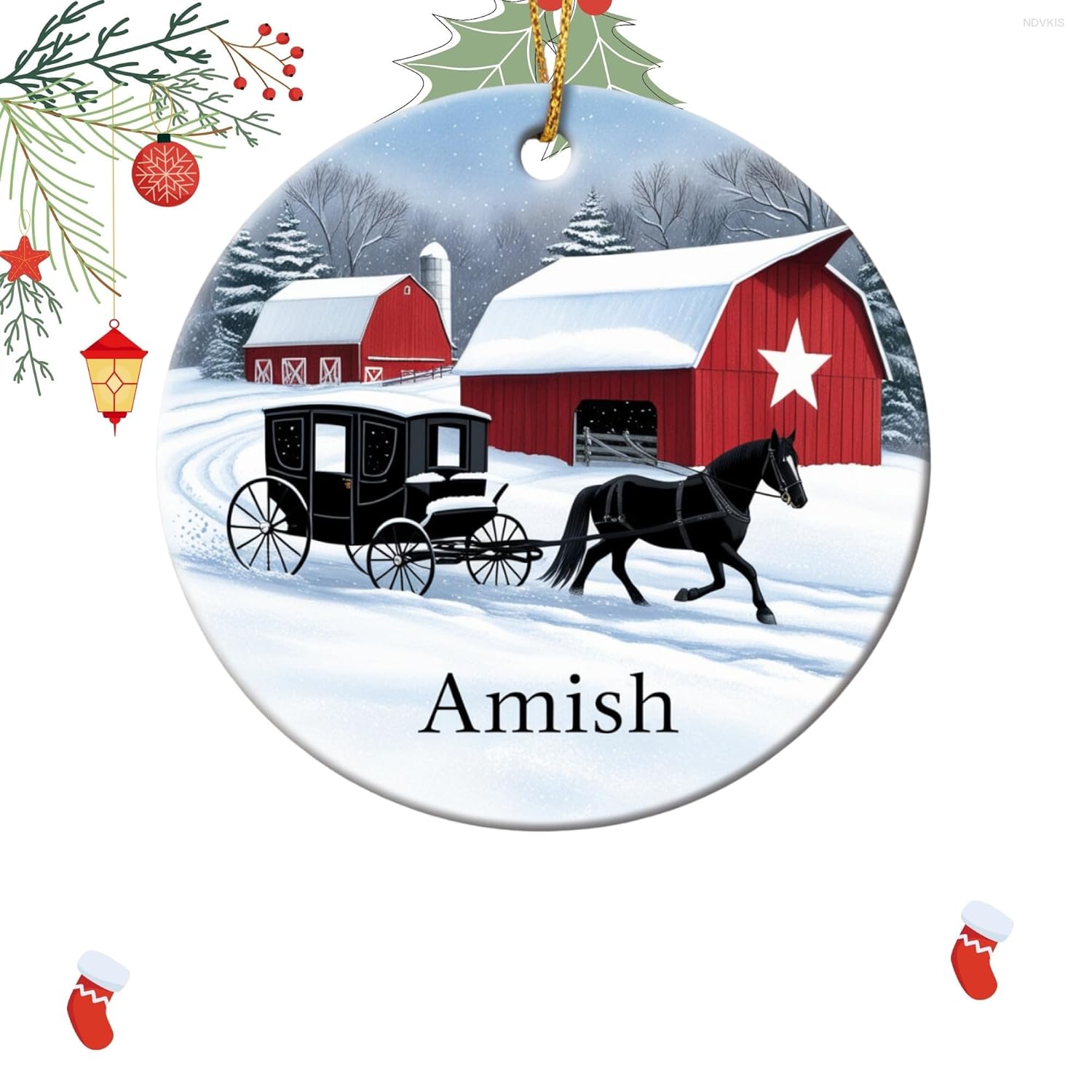 Horse and Buggy Barn Winter Snow Scene Ornament, Christmas Ornament, Amish Christmas Ornament